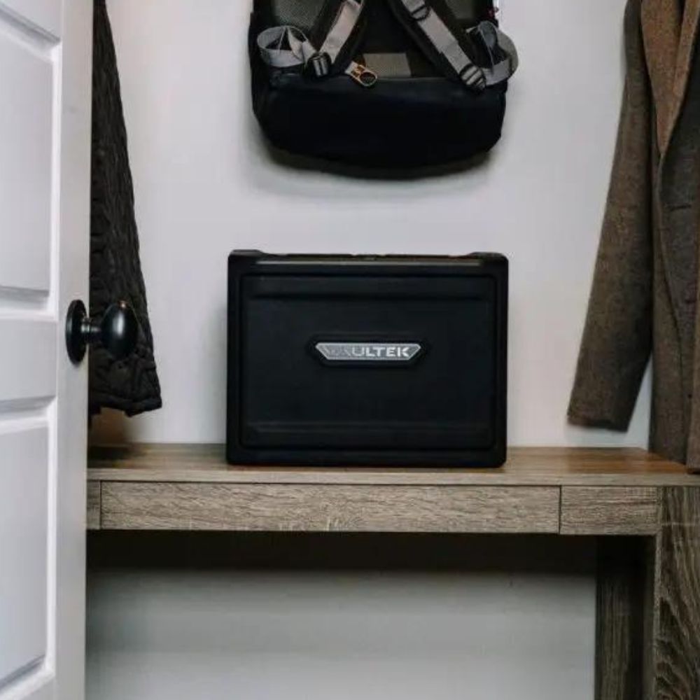 The Vaultek MX is a larger pistol safe (holds up to 8 handguns) that can carry firearms or whatever valuables you want. It offers a tray on top to keep items while not taking up necessary storage on the bottom of the safe.